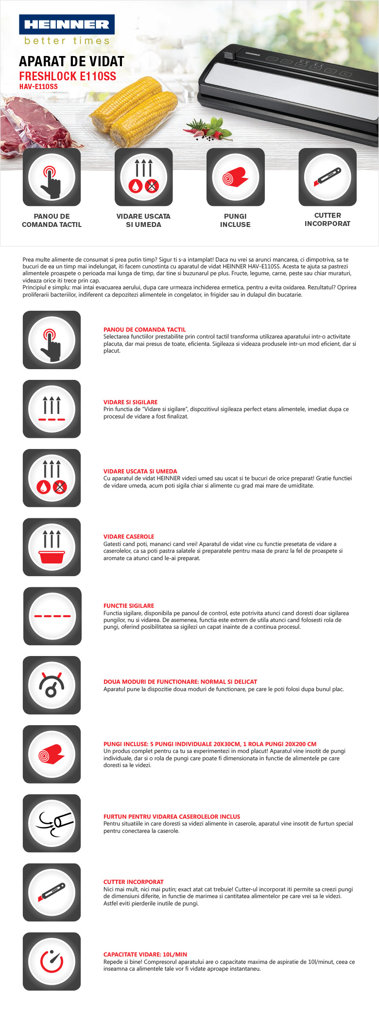 Aparat de vidat Heinner HAV-E110SS, vidare si sigilare, vidare uscata si umeda, functie sigilare, vidare caserole, control Touch, doua moduri: normal/delicat, rola pungi 20x200mm inclusa, 5 pungi individuale 20x30cm incluse, furtun pentru caserole, cutter incorporat, compatibl cu pungi latime 30cm, capacitate vidare: 10L/min, presiune: 80kpa, putere: 110W, negru cu decoratiune silver