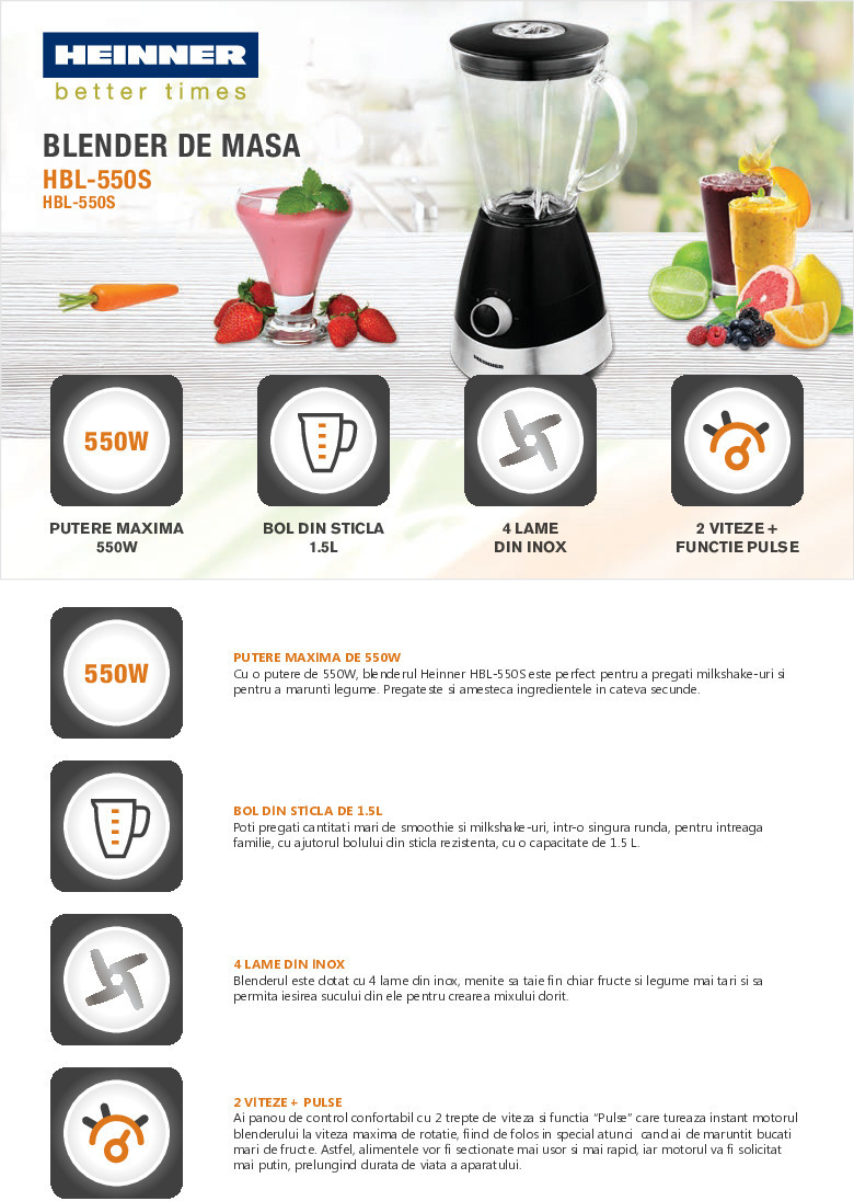 Blender de masa Heinner HBL-550S, putere: 550W, 2 viteze + functie Pulse, bol din sticla, capacitate bol 1.5L, lame detasabile din inox, sistem de siguranta, functie maruntire gheata, suport anti-alunecare, spatiu de depozitare cablu