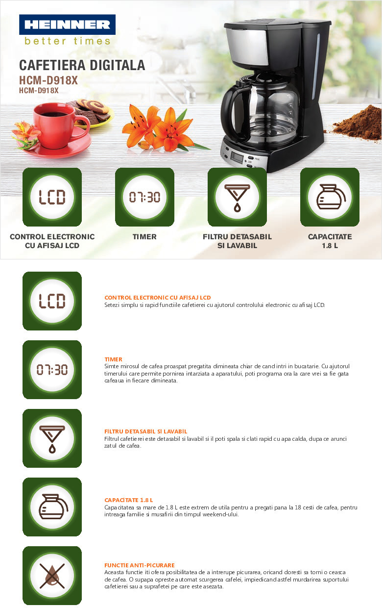Cafetiera digitala Heinner HCM-D918X, display LCD, putere: 900W, capacitate: 1.8 L, control electronic, timer programabil, afisare ceas, functie de mentinere la cald, oprire automata dupa 40 min, mecanism anti-picurare, picioruse anti alunecare, suport filtru detasabil, culoare: negru cu decoratii inox