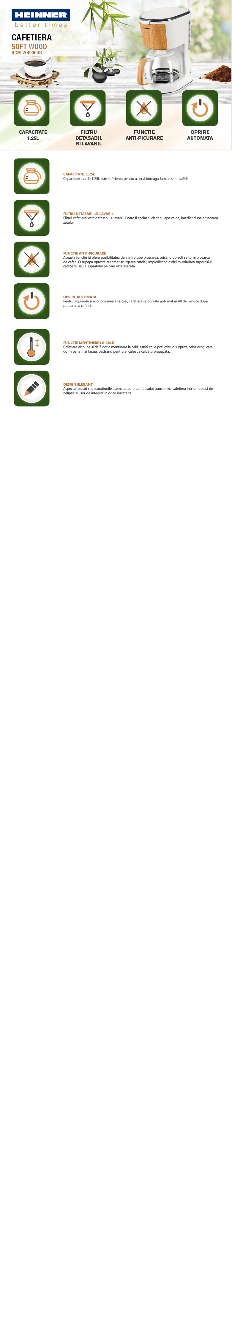 Cafetiera Heinner HCM-WH900BB, capacitate: 1.25L, filtru detasabil si lavabil, portfiltru detasabil, functie anti-picurare, oprire automata, functie pastrare la cald, indicator nivel apa, putere: 900W, design cu aspect de bambus