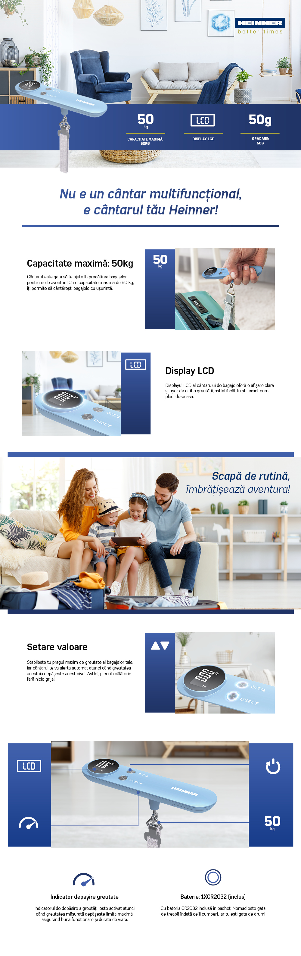 CANTAR DE BAGAJE HEINNER HLGS-50BL, 50KG, DISPLAY LCD, GRADARE: 50G, INDICATOR DEPASIRE GREUTATE, POSIBILITATE SETARE VALOARE, BATERII: 1 X CR2032 (INCLUSA), BLEU