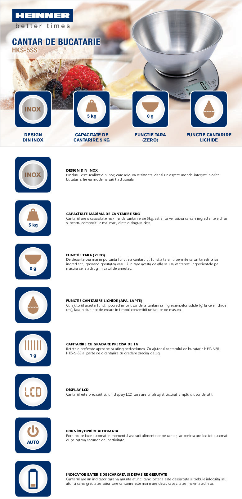 Cantar de bucatarie Heinner Optim 5 HKS-5SS, design din inox, capacitate maxima: 5kg, functie tara (zero), functie cantarire lichide (apa, lapte), gradare: 1g, display LCD, pornire / oprire automata, indicator baterie descarcata, indicator depasire greutate, baterii: 2 X AAA