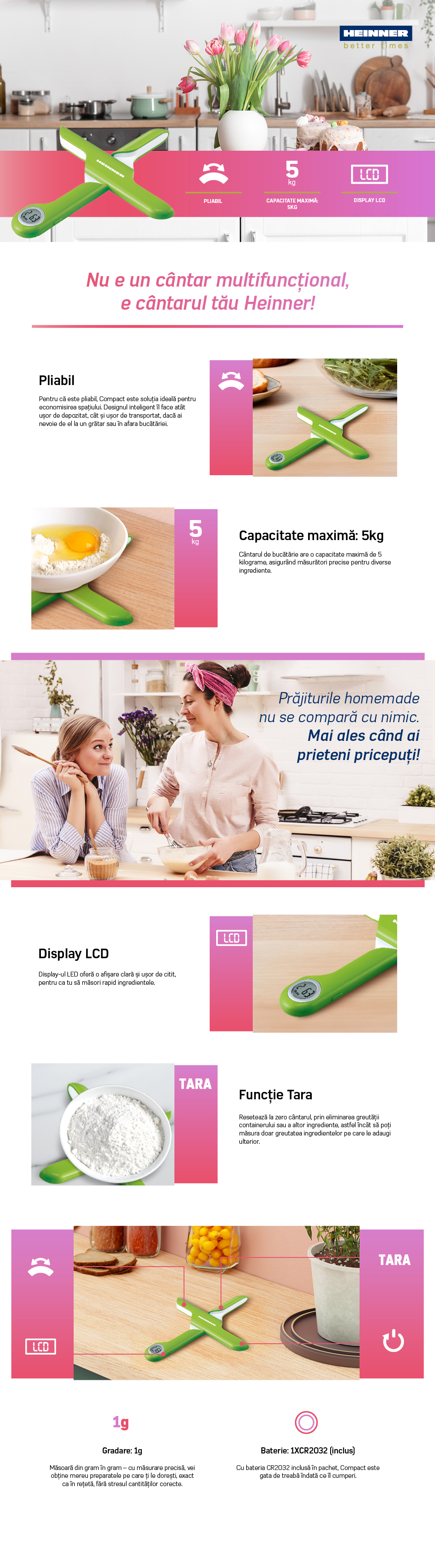 CANTAR DE BUCATARIE PLIABIL HEINNER HKS-FD5GR, 5KG, DISPLAY LCD, GRADARE: 1G, BATERII: 1 X CR2032 (INCLUSA), VERDE