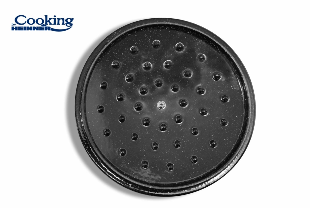Capacul din fonta cu maner din inox permite folosirea vasului si la cuptor. Acesta este prevazut cu un sistem de dispersare a aburului pe toata suprafata alimentelor pentru a ajuta la gatirea uniforma.