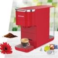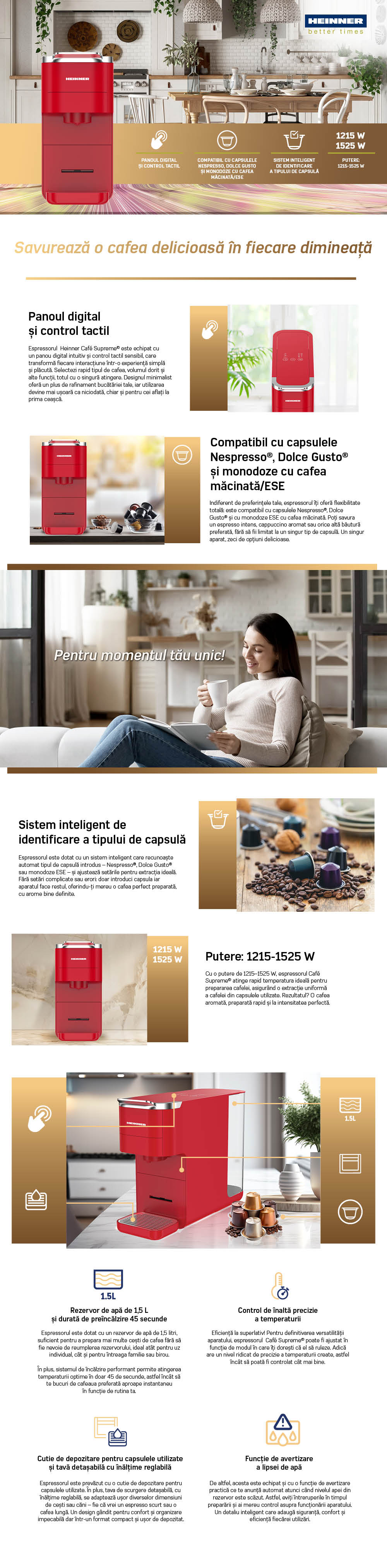 ESPRESSOR CU CAPSULE HEINNER CAFE SUPREME HEMC-DD15RED, 1400-1525W, ECRAN DIGITAL SI CONTROL TOUCH, COMPATIBIL CU NESPRESSO, DOLCE GUSTO, ESE PODS/CAFEA PUDRA, SISTEM INTELIGENT DE DETECTARE A TIPULUI DE CAPSULA, INDICATOR LUMINOS PENTRU TIPUL CAPSULEI SI VOLUM, REZERVOR APA: 1.5L, PREINCALZIRE: 45SEC, SISTEM CONTROL TEMPERATURA, MANER METALIC, COMPARTIMENT DEPOZITARE CAPSULE, TAVA SCURGERE CU INALTIME AJUSTABILA, ROSU