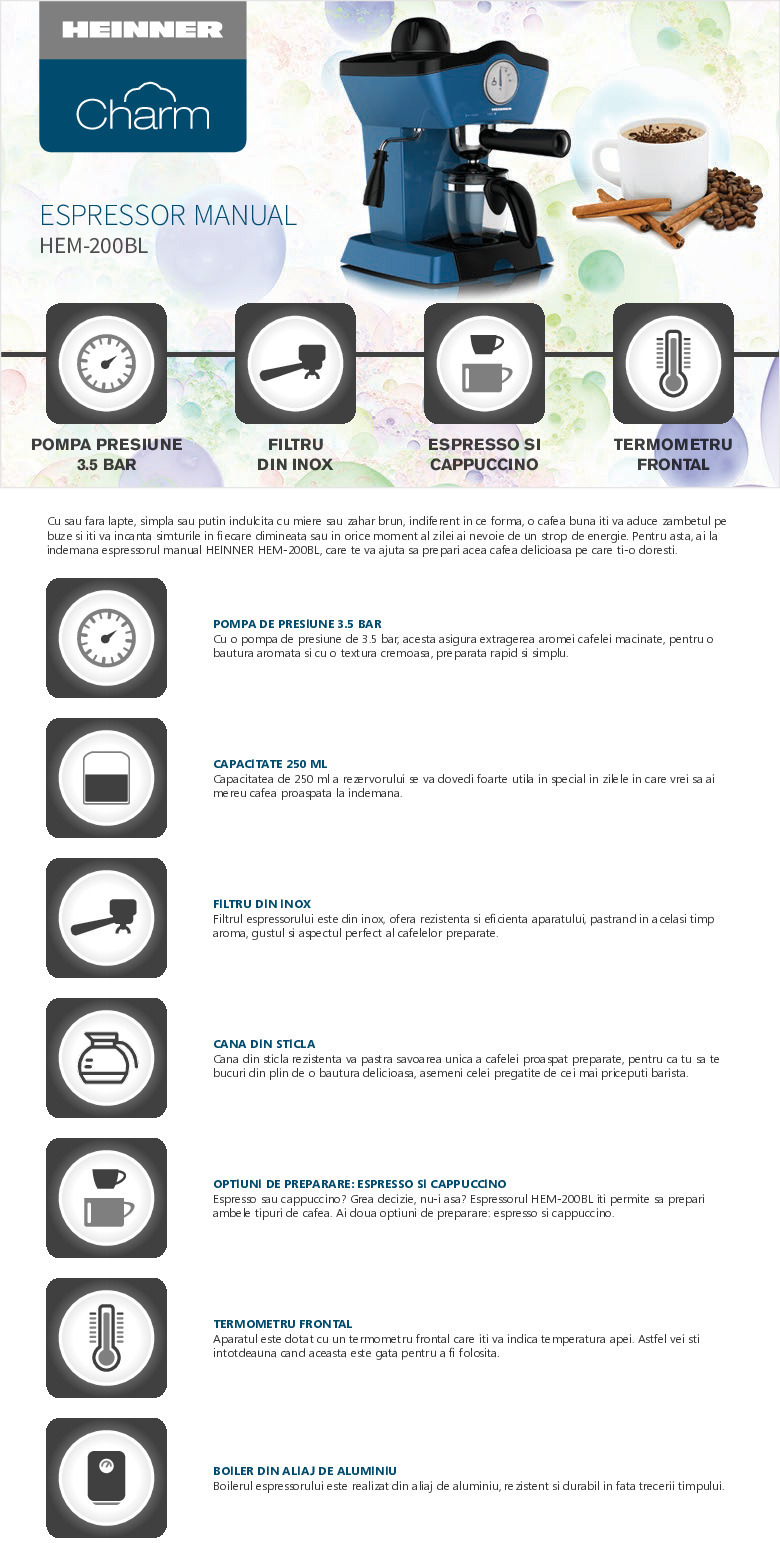 Espressor Heinner Charm HEM-200BL, putere: 800 W, capacitate rezervor detasabil transparent : 250 ml, presiune pompa: 3.5 bar, termometru frontal pentru apa, optiuni preparare: espresso si cappuccino, tavita de scurgere detasabila, boiler din aliaj de aluminiu, filtru din inox pentru 4 cesti de cafea, culoare: albastru