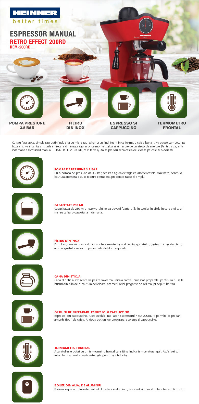Espressor Heinner HEM-200RD,putere: 800 W, capacitate rezervor detasabil transparent : 250 ml, presiune pompa: 3.5 bar, termometru frontal pentru apa, optiuni preparare: espresso si cappuccino, tavita de scurgere detasabila, boiler din aliaj de aluminiu, filtru pentru 4 cesti de cafea, culoare: rosu