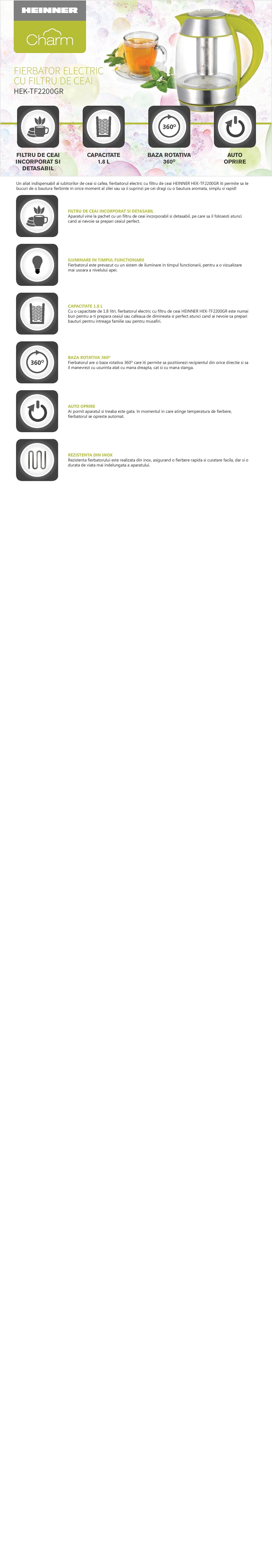 Fierbator cu filtru de ceai Heinner Charm HEK-TF2200GR, putere: 1850- 2200W, filtru de ceai incorporat, capacitate: 1.8L, iluminare LED in timpul functionarii, corp din sticla, baza rotativa 360⁰, rezistenta din inox acoperita, oprire automată, culoare: verde