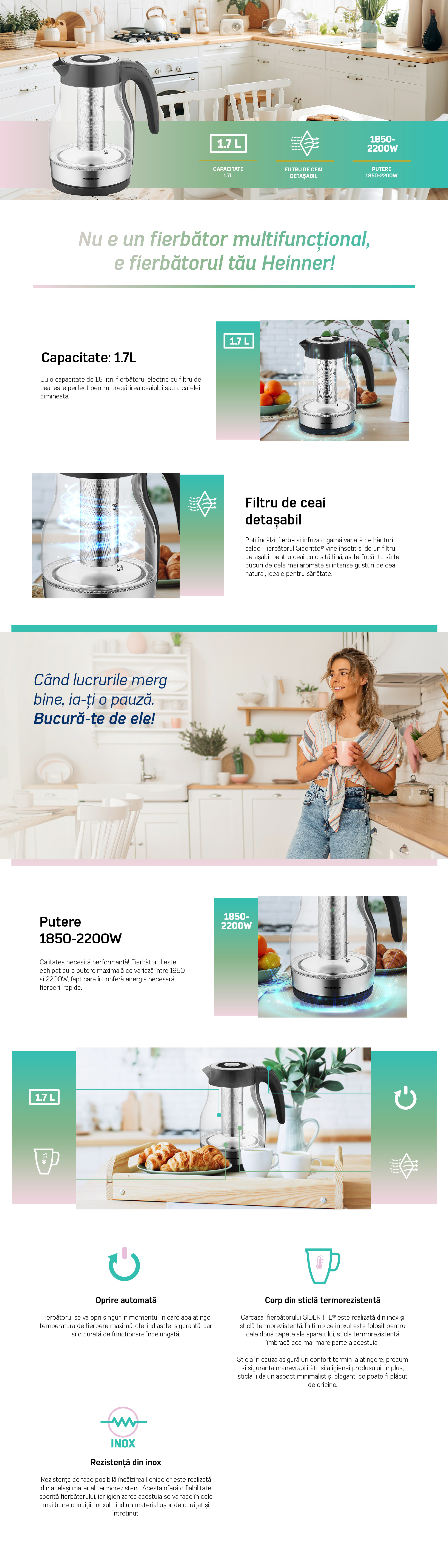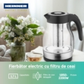 FIERBATOR ELECTRIC CU FILTRU CEAI HEINNER HEK-TF2200GBK, 1850-2200W, 1.7L, FILTRU CEAI DETASABIL, INEL LUMINOS LED, OPRIRE AUTOMATA, PROTECTIE IMPOTRIVA FUNCTIONARII FARA APA, ELEMENT INCALZIRE INOX, CORP STICLA REZISTENTA LA CALDURA