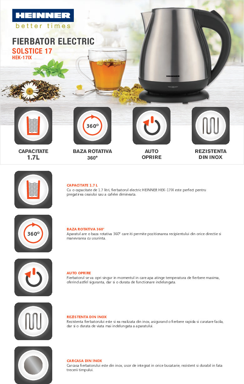 Fierbator electric Heinner Solstice 17 HEK-17IX, capacitate: 1.7L, baza rotativa 360˚, filtru detasabil si lavabil, element de incalzire din inox, protectie impotriva functionarii fara apa, auto oprire, buton ON/OFF, putere: 1850-2200W, inox