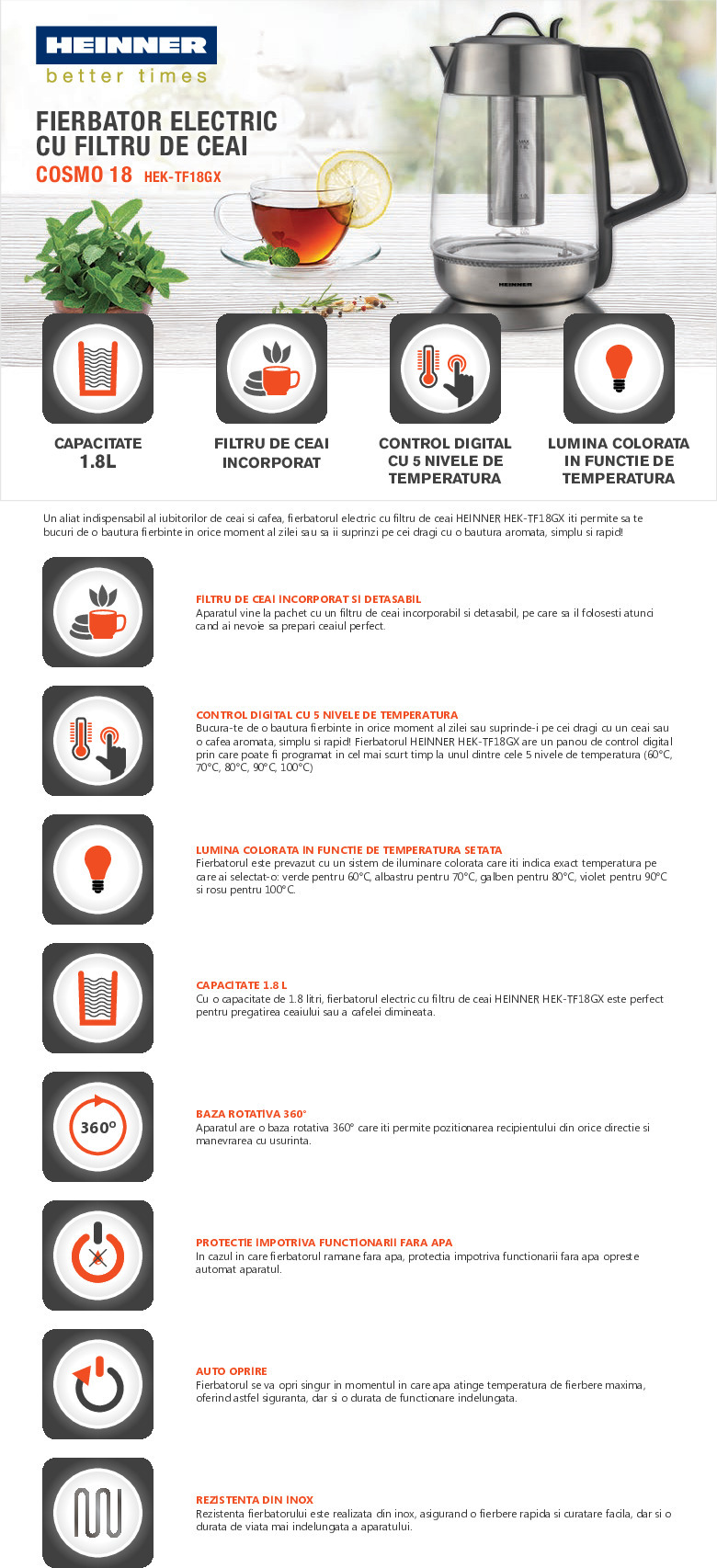 Fierbator electric Heinner HEK-TF18GX, cu filtru pentru ceai, capacitate: 1.7L, 5 niveluri