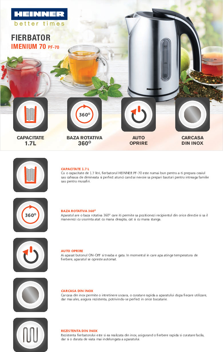 Fierbator Heinner Express-805, Inox, Filtru detasabil si lavabil, Baza rotativa 360 grade, Auto-oprire, Rezistenta acoperita, Buton ON/OFF, Capacitate: 1.7L, Putere: 2200W