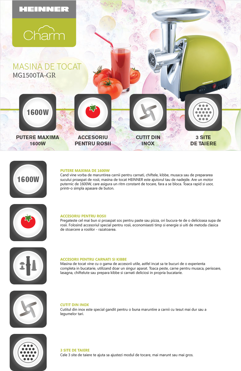 Masina de tocat Charm Heinner MG1500TA-GR, accesoriu pentru rosii, putere maxima: 1600W, f