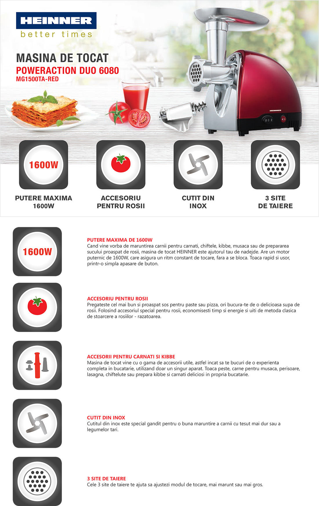 Masina de tocat Heinner MG1500TA-red, accesoriu pentru rosii, putere maxima: 1600W, functi