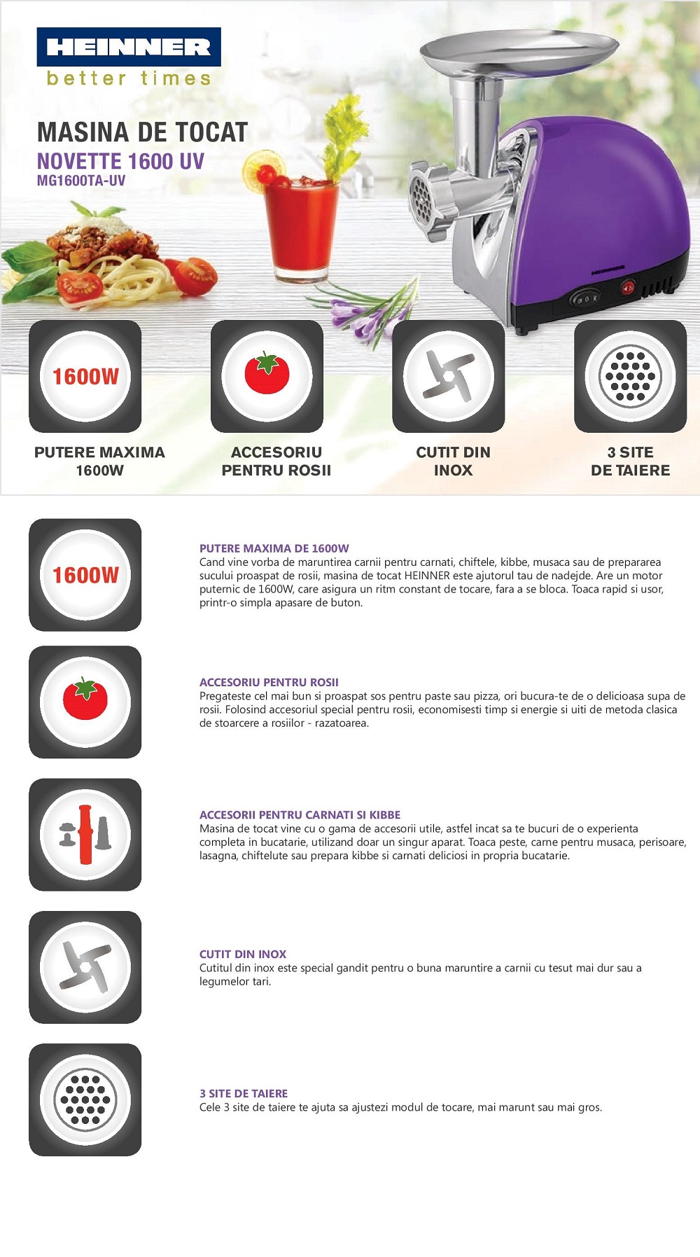 Masina de tocat Heinner Novette 1600 MG1600TA-UV, putere maxima: 1600W, capacitate de procesare: 2kg/min, trei site de taiere: 0.3/0.5/0.7mm, cutit din inox, accesoriu pentru rosii, accesoriu pentru carnati, functie reverse, buton ON/OFF, culoare: ultraviolet