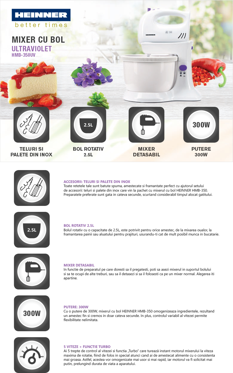 Mixer cu bol Heinner HMB-350UV, putere: 300W, 5 viteze+turbo, bol rotativ: 2.5 l, accesorii din inox: 2 teluri + 2 carlige pentru framantare, buton ejector cu dispozitiv de siguranta, buton eliberare mixer de mana, culoare: ultraviolet