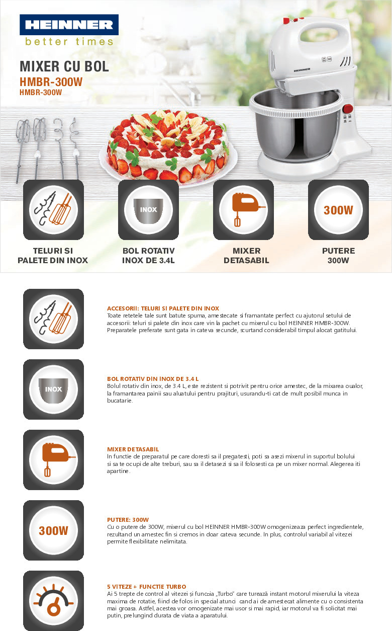 Mixer cu bol Heinner HMBR-300W, Bol rotativ din inox, capacitate: 3.4 L putere: 300W, 5 vi