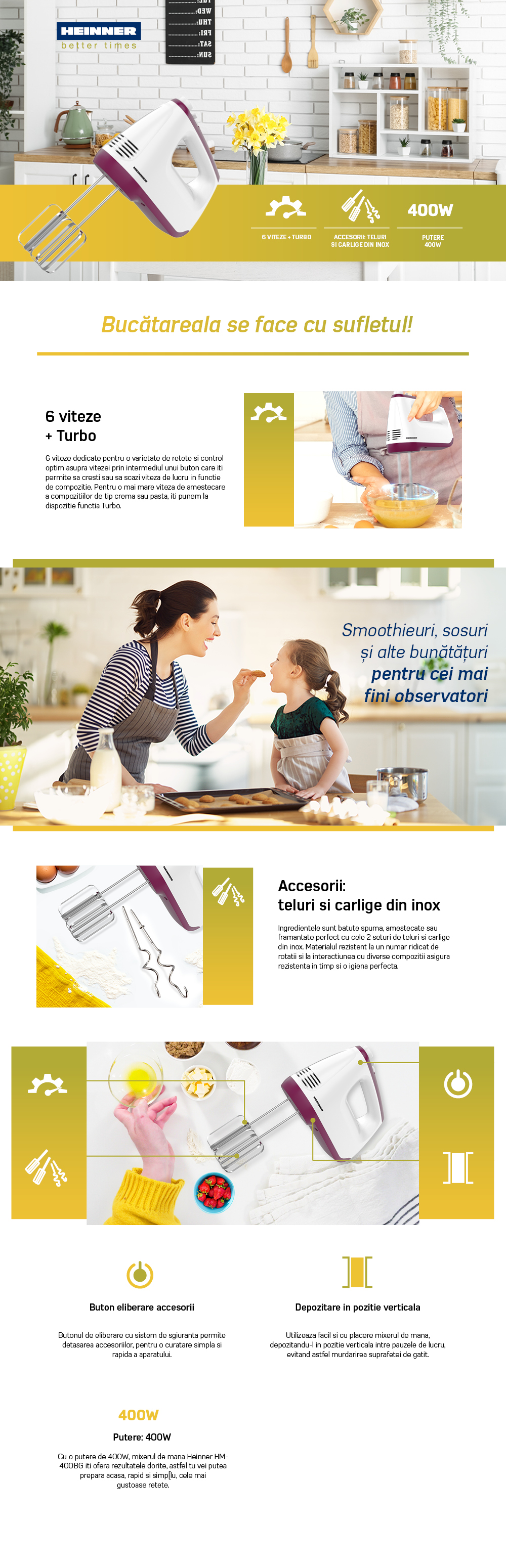 MIXER DE MANA HEINNER HM-400BG, PUTERE: 400W, 2 TELURI SI 2 CARLIGE DIN INOX, 6 VITEZE + T
