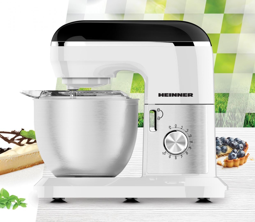MIXER PLANETAR HEINNER HPM-1300WHBK, 1000W, BOL INOX: 5L, 10 VITEZE + PULSE, ACCESORII: TEL, CARLIG FRAMANTARE, PALETA, CAPAC TRANSPARENT PROTECTIE, ALB