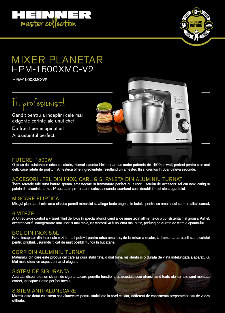 Mixer planetar Heinner HPM-1500XMC-V2, putere: 1500W, 6 viteze, capacitate bol: 5.5L, corp mixer din aluminiu turnat, bol din inox, protectie anti-stropire, sistem anti-alunecare, accesorii: carlig pentru framantare, paleta din aluminiu trunat, tel din inox, nivel de zgomot: 93dB