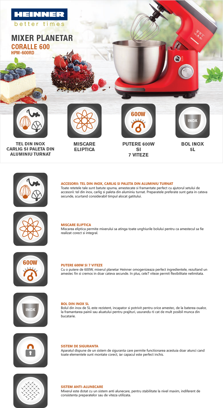 Mixer planetar Heinner HPM-600RD, miscare eliptica, 7 viteze, capacitate bol din inox: 5L, tel din inox, carlig si paleta din aluminiu turnat, putere: 600W, protectie anti-stropire, buton de blocare, sistem anti- alunecare, rosu