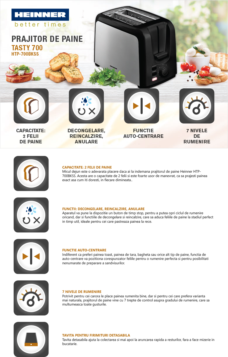 Prajitor de paine Heinner HTP-700BKSS, functii decongelare, reincalzire, anulare, 7 nivele de rumenire, functie auto-centrare, maner rece, putere: 750W, tavita de firimituri detasabila, spatiu pentru depozitare cablu, decoratii din inox