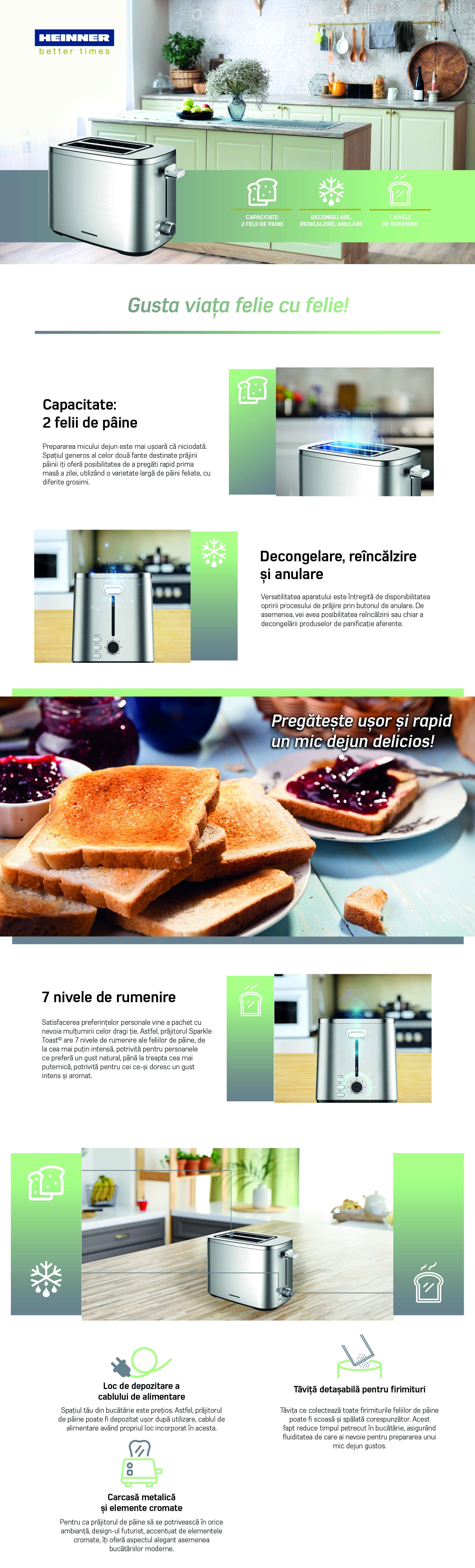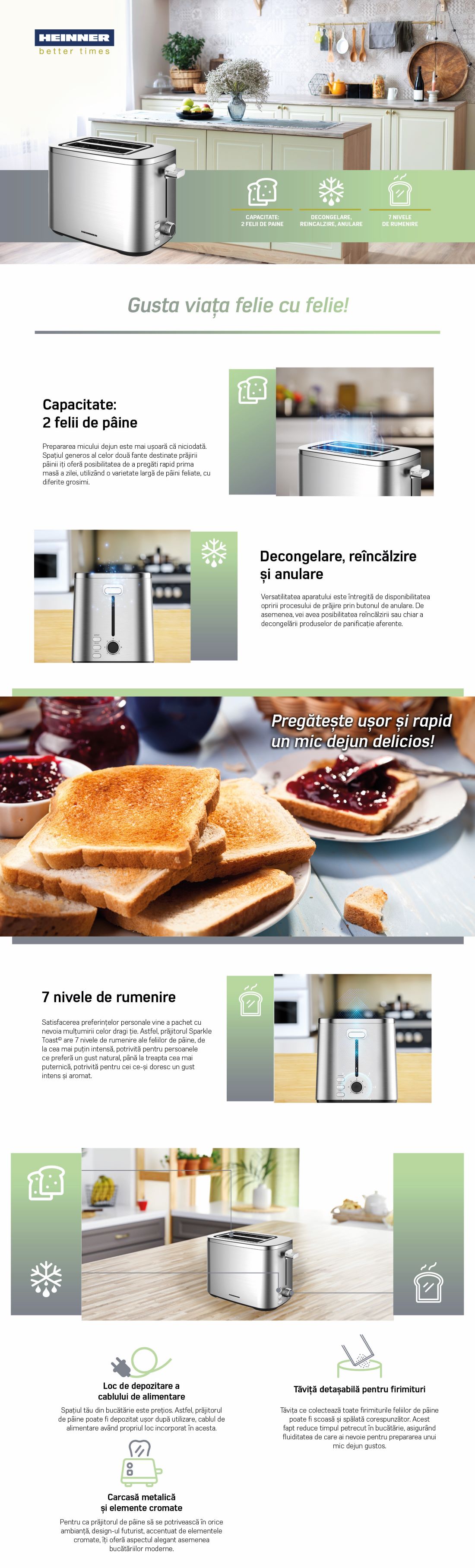 PRAJITOR DE PAINE HEINNER SPARKLE TOAST HTP-800SS, 800W, CAPACITATE: 2 FELII, 7 NIVELURI RUMENIRE, FUNCTII: REINCALZIRE, DECONGELARE, ANULARE, INDICATOR LED LUMINOS, SPATIU DEPOZITARE CABLU ALIMENTARE, CARCASA METAL