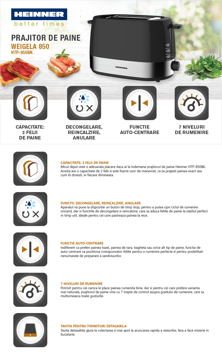 Prajitor de paine Heinner Roastit 850 HTP-850BK, putere: 720-850W, capacitate: 2 felii, decongelare / reincalzire / anulare, 7 niveluri de rumenire, auto-centrare, tavita pentru firimituri detasabila, indicator luminos, ornamnete din inox, spatiu depozitare cablu de alimentare