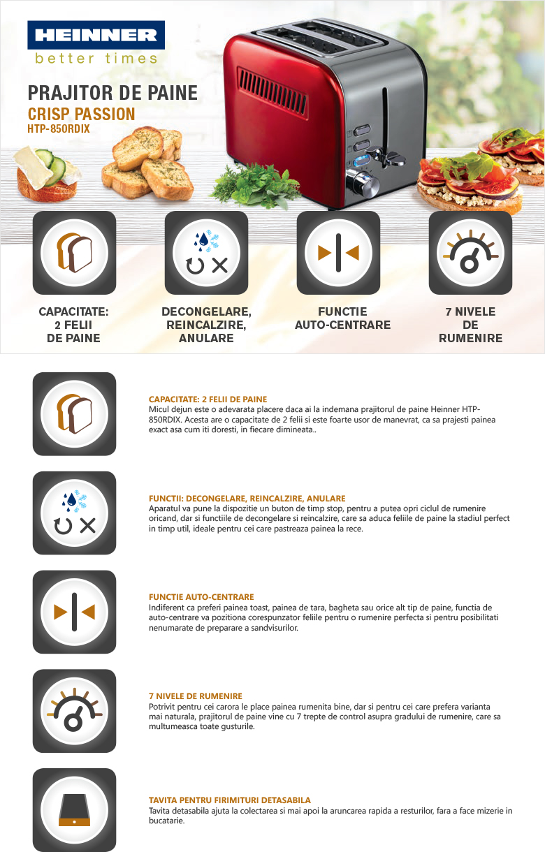 Prajitor de paine Heinner HTP-850RDIX, capacitate: 2 felii, functii decongelare, reincalzire, anulare, 7 nivele de rumenire, functie auto- centrare, tavita de firimituri detasabila, spatiu depozitare cablu, putere: 715-850W, carcasa din inox, culoare: rosu