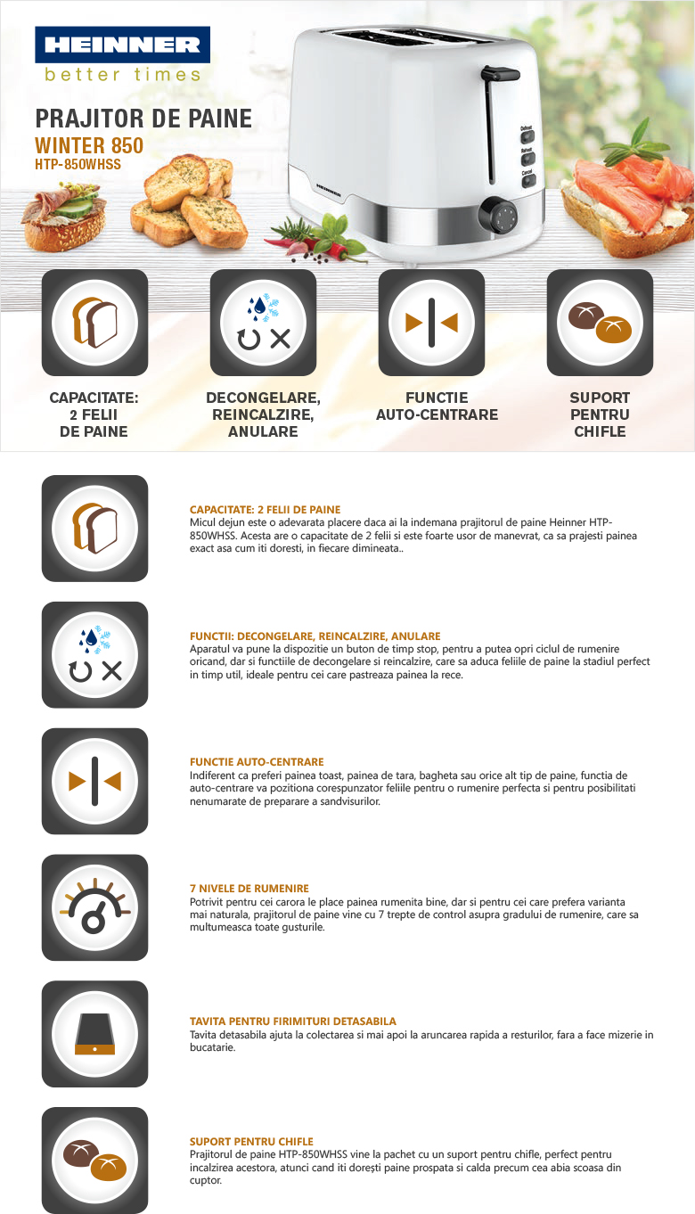 Prajitor de paine Heinner HTP-850WHSS, funtii decongelare, reincalzire, anulare, 7 nivele de rumenire, functie auto-centrare, capacitate: 2 felii, tavita pentru firimituri detasabila, spatiu pentru depozitare cablu, alb cu decoratii din inox