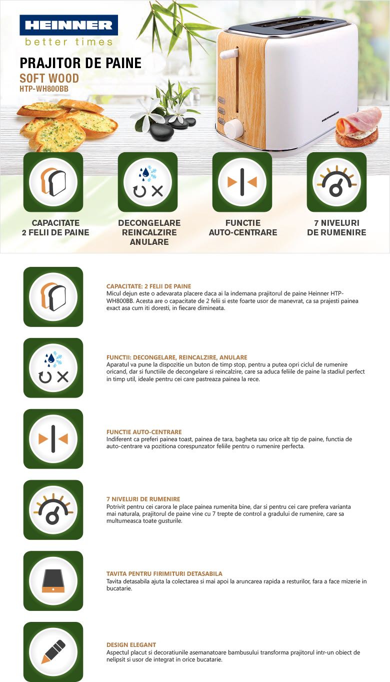 Prajitor de paine Heinner HTP-WH800BB, dezghetare, oprire, reincalzire, 7 nivele de rumenire, tavita pentru firimituri detasabila, functie auto- centrare, spatiu depozitare cablu alimentare, putere: 800W, design cu aspect de bambus