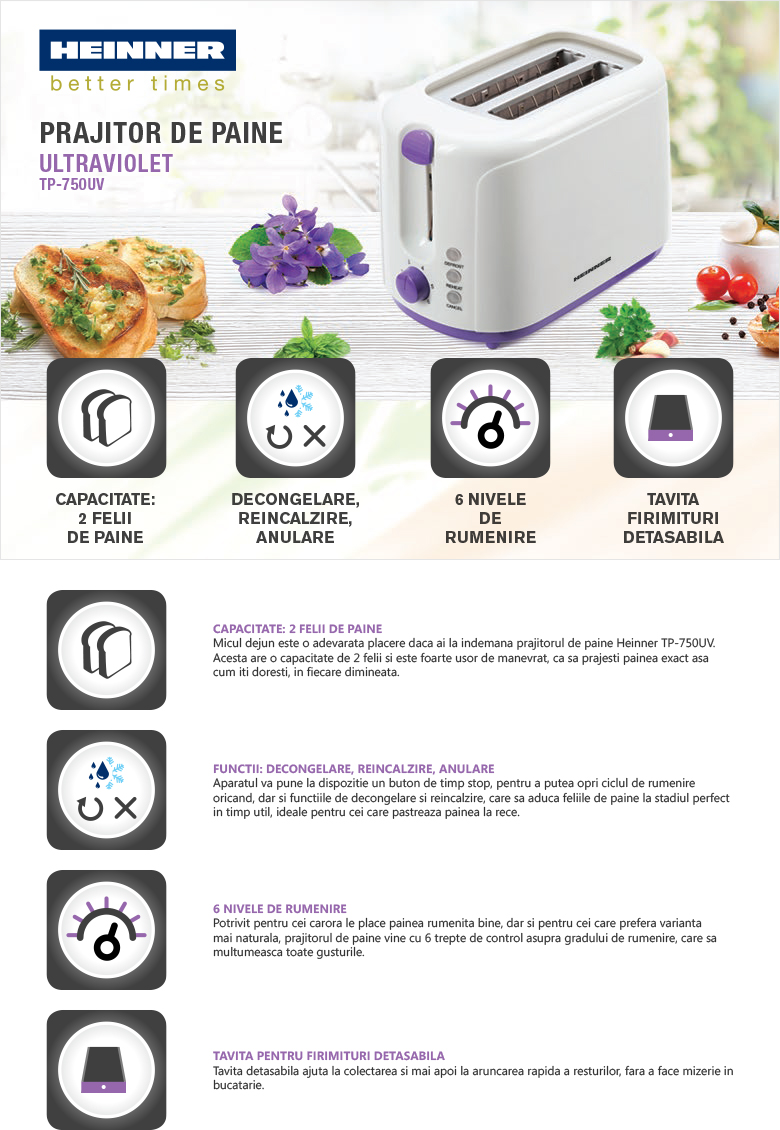 Prajitor de paine Heinner TP-750UV, putere: 750W, 6 nivele de rumenire, 3 functii: dezghetare, reincalzire si oprire, control variabil al temperaturii, functie oprire automata, tavita firimituri detasabila, culoare: ultraviolet