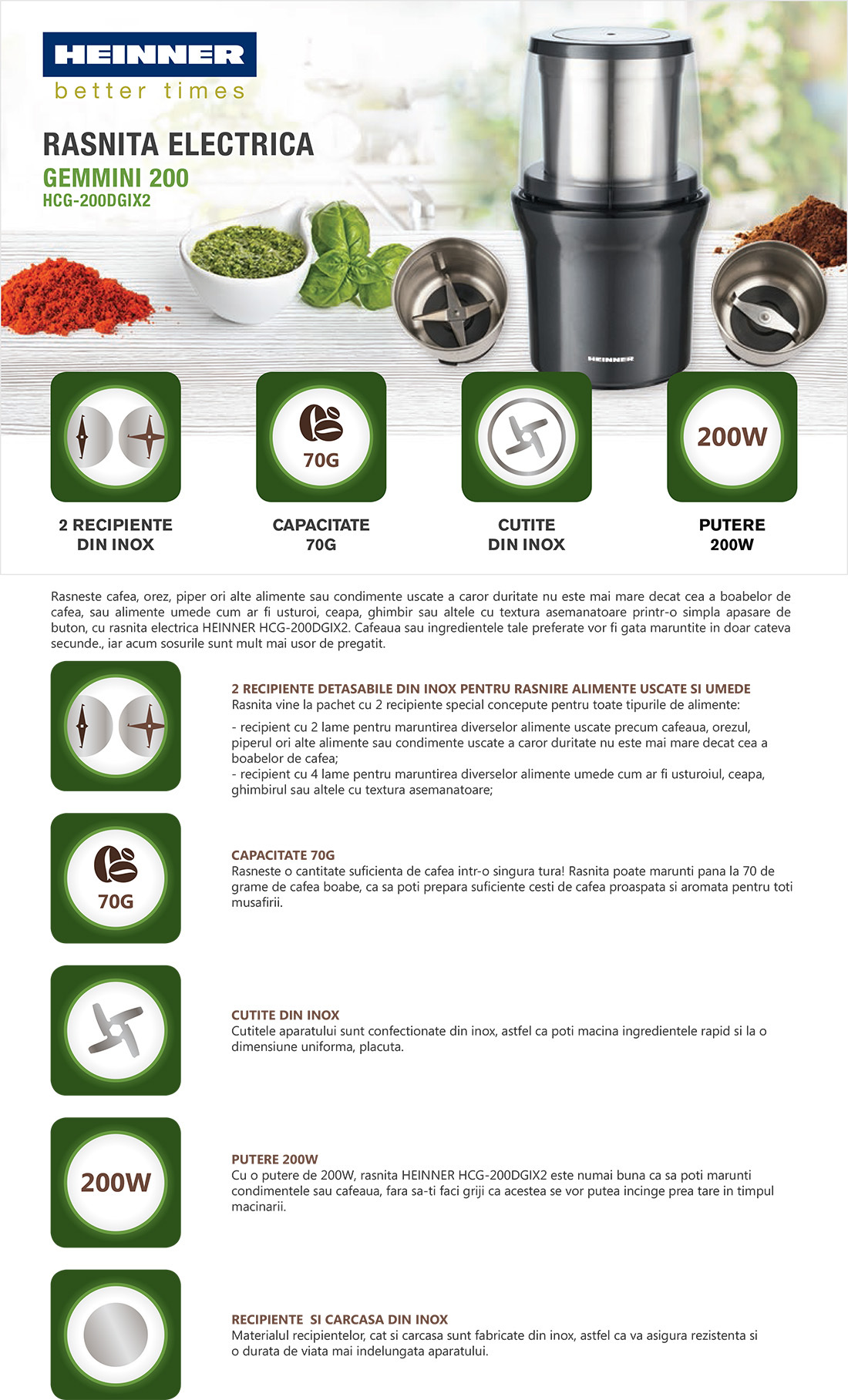 Rasnita electrica HEINNER HCG-200DG2, 2 recipiente din inox detasabile, rasnire uscata si umeda, lame din inox, capacitate 70g, operare prin apasare capacului, carcasa din inox, putere 200W, gri sidef inchis