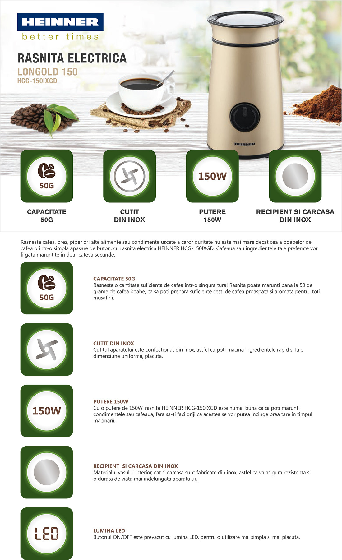 Rasnita electrica HEINNER HCG-150IXGD, putere 150W, capacitate 50G, interior din inox, lame din inox, sistem de siguranta, buton ON/OFF, indicator LED, auriu sidefat