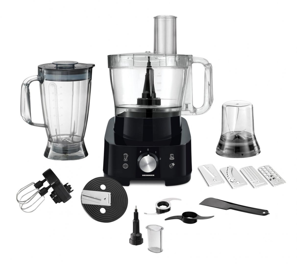 Robot de bucatarie Heinner HFP-1000BK, putere: 1000W, capacitate bol procesare: 3.5L, capacitate blender: 1.8L, rasnita, ansamblu teluri inox, accesorii pentru maruntire si feliere, 2 viteze + Pulse, cutit din inox