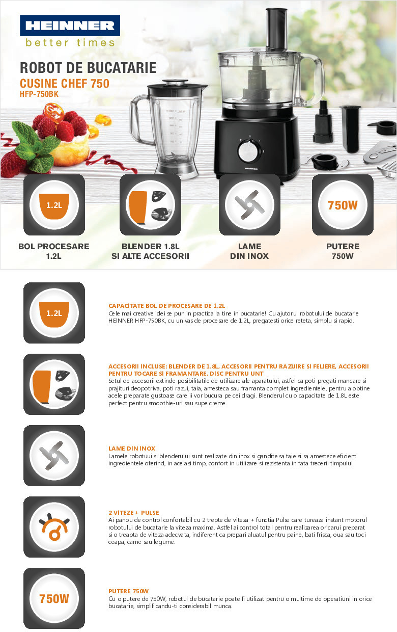 Robot de bucatarie Heinner HFP-750BK, putere: 750W, 2 viteze + Pulse, capacitate bol procesare: 1.2L, capacitate blender: 1.8L, accesorii pentru feliere, maruntire, unt si cartofi French, sistem de siguranta cu dubla inchidere, sistem anti-alunecare, nivel de zgomot: 85dB