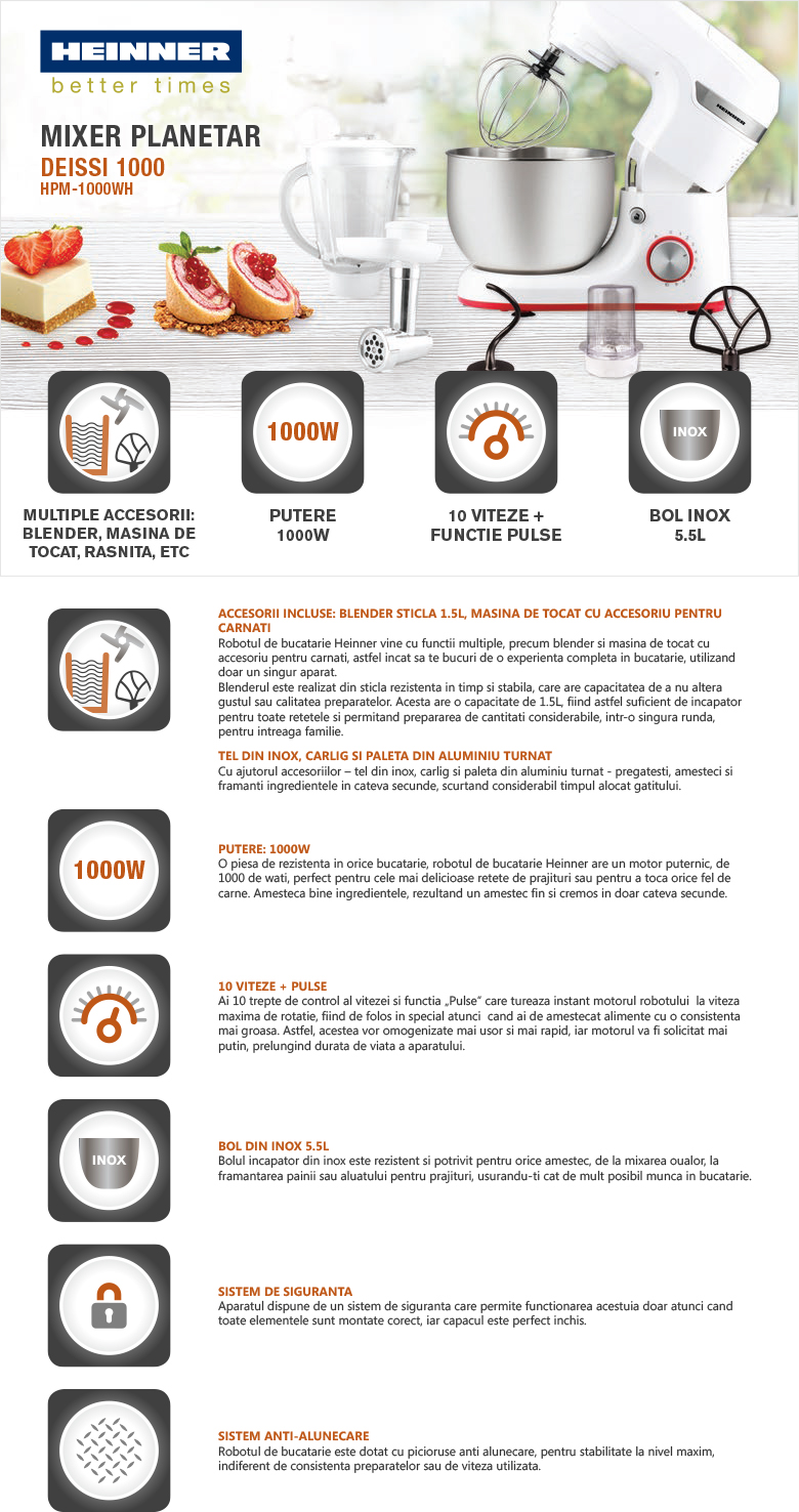 Robot de bucatarie Heinner HPM-1000WH, putere maxima: 1000W, accesoriu masina de tocat, accesoriu blender 1.5L, bol inox 5.5L, miscare planetara, carlig si paleta cu invelis din Teflon, tel din inox, 10 viteze + Pulse, capac anti-stropire, picioruse anti-alunecare