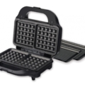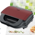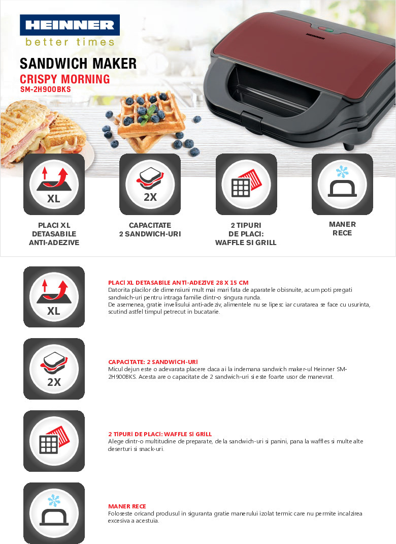 Sandwich maker Heinner SM-2H900BKS, placi detasabile anti-adezive XL, placi grill si waffles, capacitate: 2 sandwich-uri, indicator luminos "gata de folosire", indicator luminos alimentare, dimensiuni placi: 28 x 15 cm, maner rece, putere: 900W, negru/rosu sidef