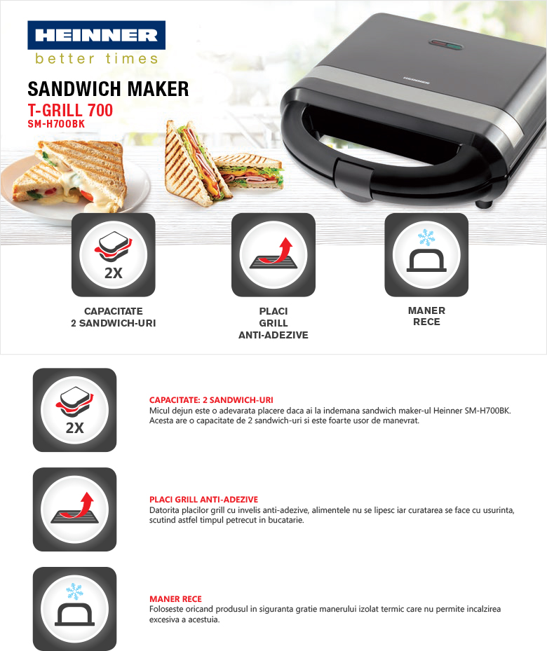 Sandwich maker Heinner SM-H700BK, placi grill fixe antiadezive, capacitate 2 sandwich-uri, maner rece, indicator luminos "gata de folosire", indicator luminos alimentare, dimensiuni placi: 22.3 x 13 cm, putere: 700W,negru