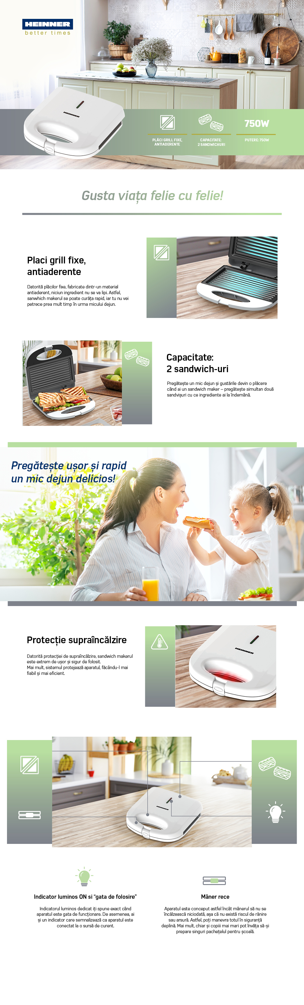 Sandwich maker Heinner SM-K750FGWH, putere: 750W, capacitate: 2 sandwich-uri, placi fixe grill anti-aderente, indicator luminos ON si "gata de folosire", protectie supraincalzire, maner rece, spatiu depozitare cablu alimentare, design depozitare verticala, alb