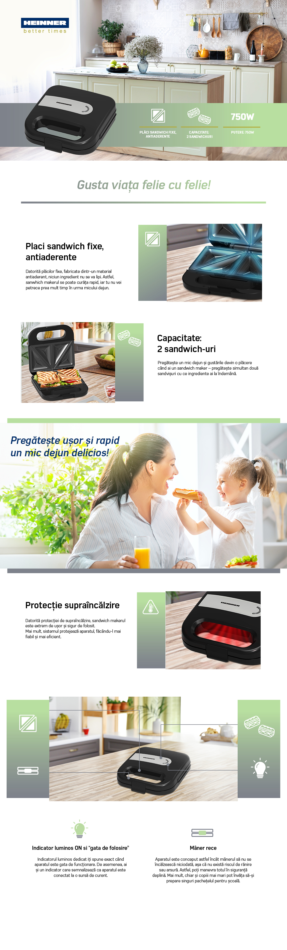 Sandwich maker Heinner SM-K750FSBK, putere: 750W, capacitate: 2 sandwich-uri, placi sandwich fixe anti-aderente, indicator luminos ON si "gata de folosire", protectie supraincalzire, maner rece, spatiu depozitare cablu alimentare, negru
