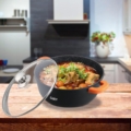 Semioala aluminiu turnat +capac , 24 cm x 11.5 cm , 4.4 L, DARK LINEnterior : ceramica neagra marmorataEcterior : vopseatermorezistenta, neagra marmorataCapac : sticla termorezistenta cu maner inoxProtectie silicon pentru manereINDUCTIE