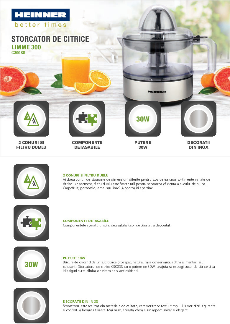 Storcator de citrice Heinner C300SS, capacitate: 0.5L, 2 conuri, filtru dublu, doua directii de rasucire, componente detasabile pentru curatare usoara, putere: 30W