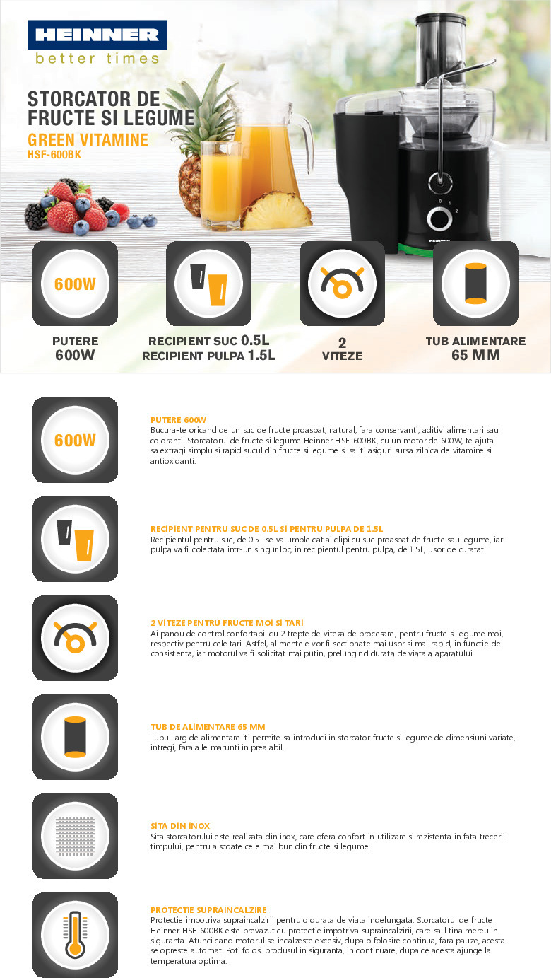 Storcator de fructe si legume Heinner HSF-600BK, putere: 600W, tub de alimentare: 65mm, recipient pulpa: 1.5L, recipient suc: 0.5L, 12000- 14000rpm, sita din inox, 2 viteze, picioruse anti-alunecare, nivel de zgomot: 85dB