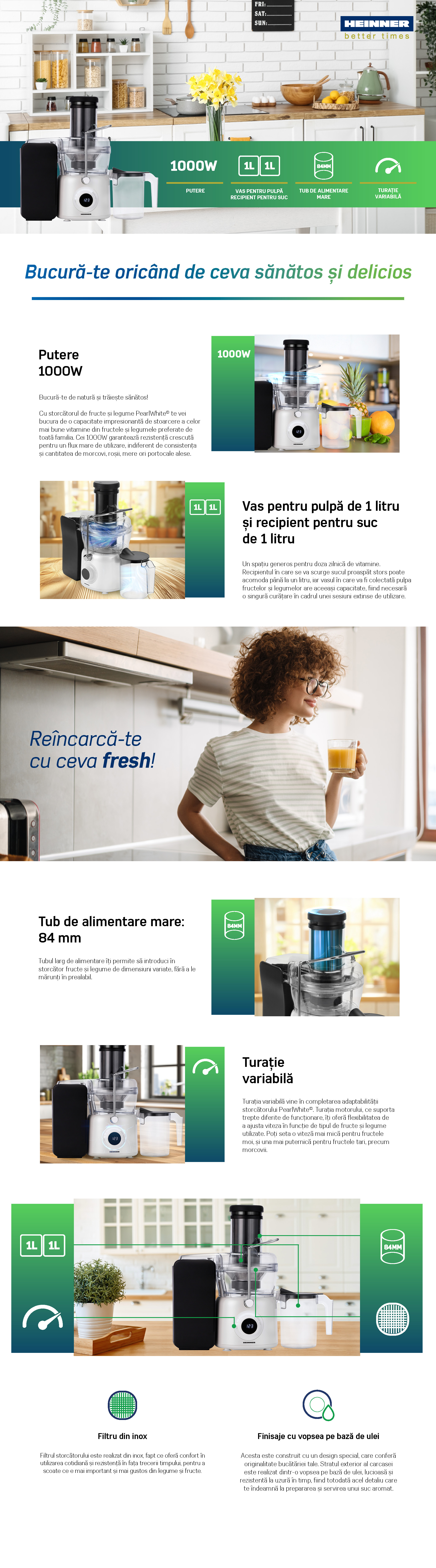 STORCATOR DE FRUCTE HEINNER PEARLWHITE HSF-K1000DCWP, 1000W, MOTOR DC, VITEZA VARIABILA, RECIPIENT PULPA 1L, FILTRU INOX, TUB LARG ALIMENTARE 84MM, CARCASA ALBA VOPSITA IN ULEI