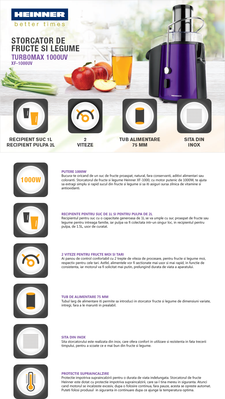Storcator de fructe Heinner Turbomax 1000UV XF-1000UV, 2 viteze, putere: 1000W, recipient suc: 1L, recipient pulpa: 2L, protectie motor: auto oprire, tub larg de alimentare: 75mm, nivel de zgomot: 78db, culoare: ultraviolet
