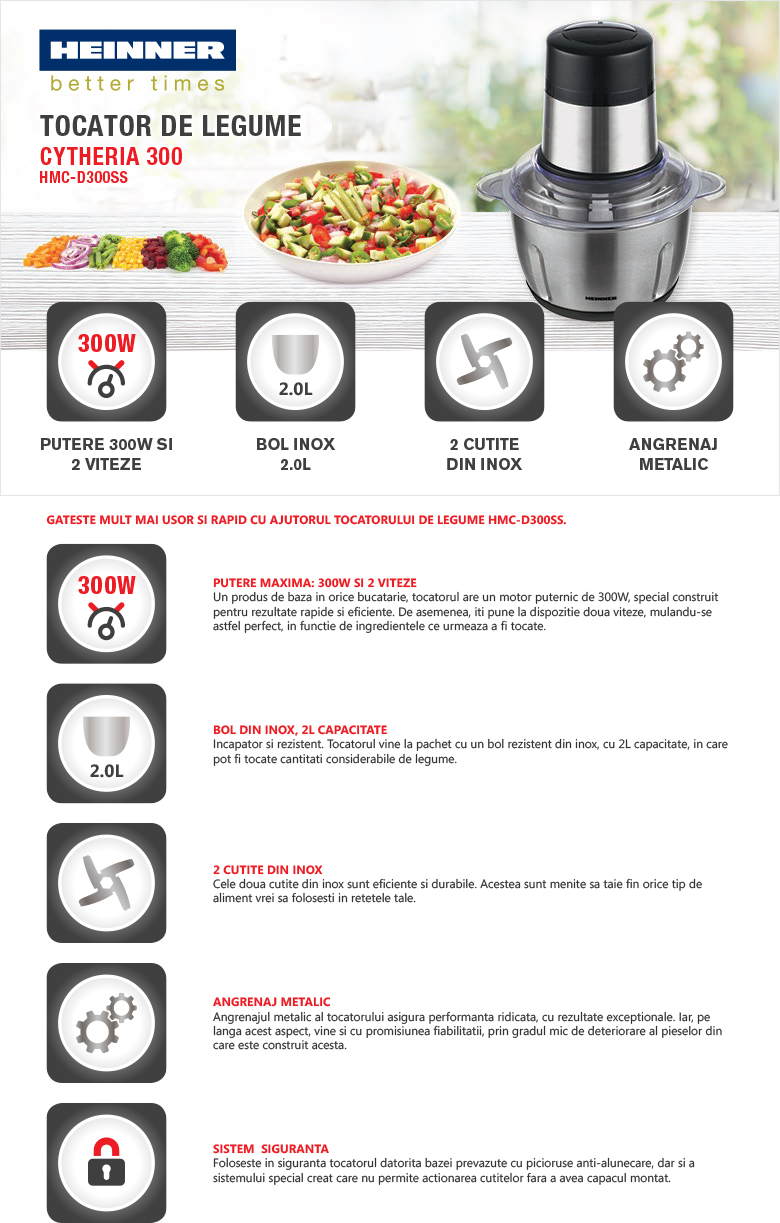 Putere maxima: 300W, bol din inox, capacitate 2L, 2 cutite din inox, 2 viteze, angrenaj metalic, sistem de siguranta