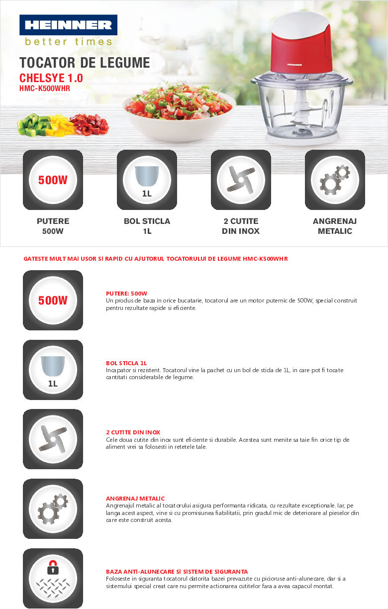 Tocator de legume Heinner HMC-K500WHR, capacitate: 1L, bol din sticla, angrenaj metalic, 2 cutite din inox, baza anti-alunecare, sistem de siguranta, putere: 500W