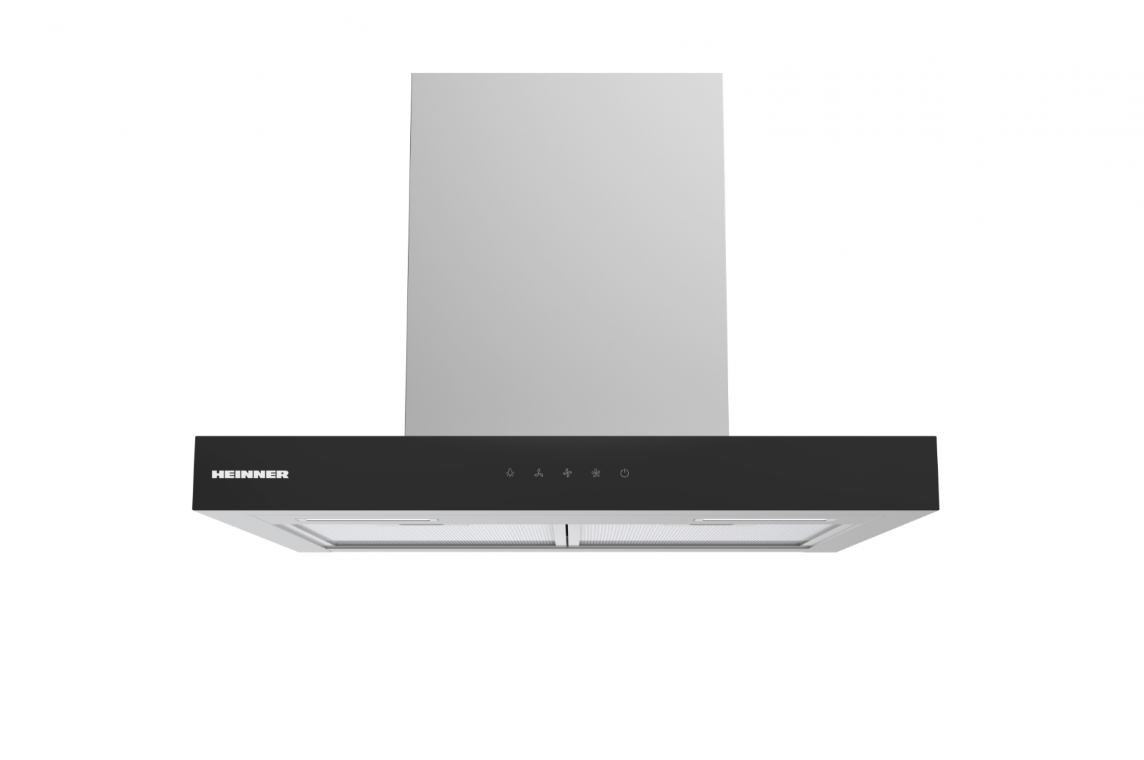 Hota decorativa Heinner HDCH-F4560TIX, 60cm, Design "T-Shape", Putere maxima de absorbtie: 488.04 m³/h, 3 trepte de viteza, Motor: 1 x 120W, Lumina LED: 2 x 1.5W, 2 filtre aluminiu, Control touch, Diametru tub evacuare: 150mm, Dimensiuni (LxAxI): 59.5x50x(54.8-99.8) cm, Culoare: Inox+Sticla neagra