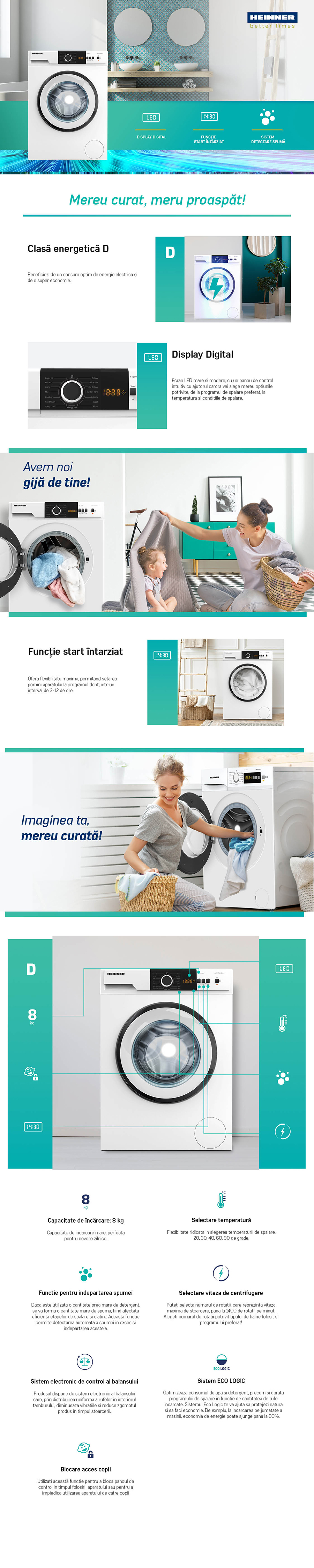 MASINA DE SPALAT RUFE HEINNER HWM-VT1814KD++, CAPACITATE 8KG, VITEZA DE CENTRIFUGARE 1400RPM, CLASA ENERGETICA D, 15 PROGRAME, DISPLAY DIGITAL, PROGRAM RAPID 15 MIN, PROGRAM SCURT 60 MIN, PROGRAM ALLERGY SAFE, FUNCTIE START INTARZIATE, SISTEM ECO LOGIC, SISTEM DETECTARE SPUMA, SISTEM DE CONTROL ELECTRONIC AL BALANSULUI, BLOCARE ACCES COPII, DIMENSIUNI ( LXAXI): 59.7X55.7X84.5 CM, CULOARE: ALB
